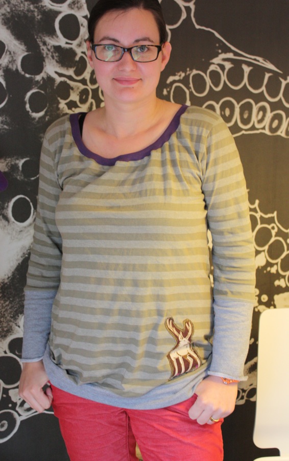 Der Ausschnitt war mir zu weit, deshalb habe ich ihn mit dem Bündchen etwas gerafft. Dadurch fällt er aber nicht mehr so schön.
